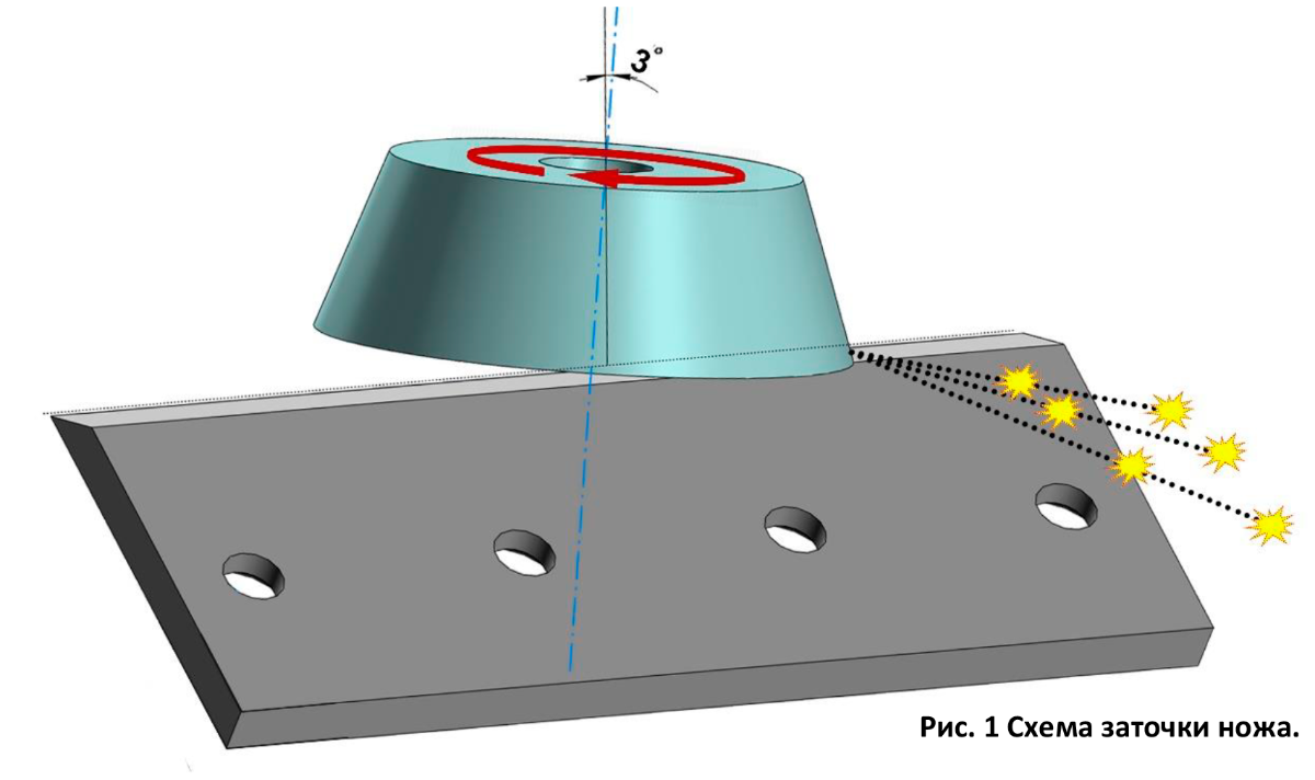 Угол наклона оси шлифовальной головки (шпинделя) к вертикали - 1…3°. При большем угле наклона происходит искажение угла заточки и ослабление сечения лезвия.